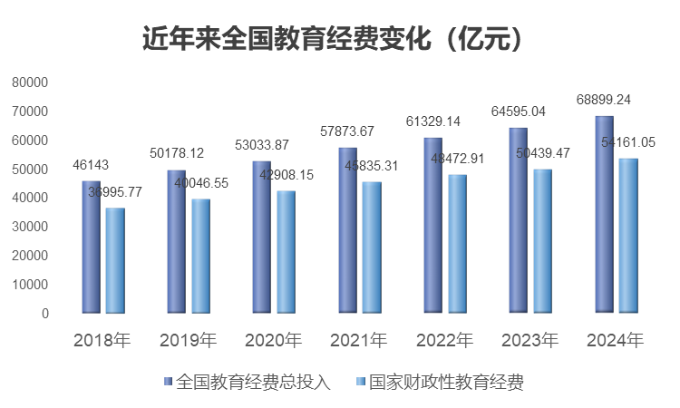 全国教育经费总投入2019年突破5万亿元、2022年突破6万亿元,2024年已逼近7万亿元。